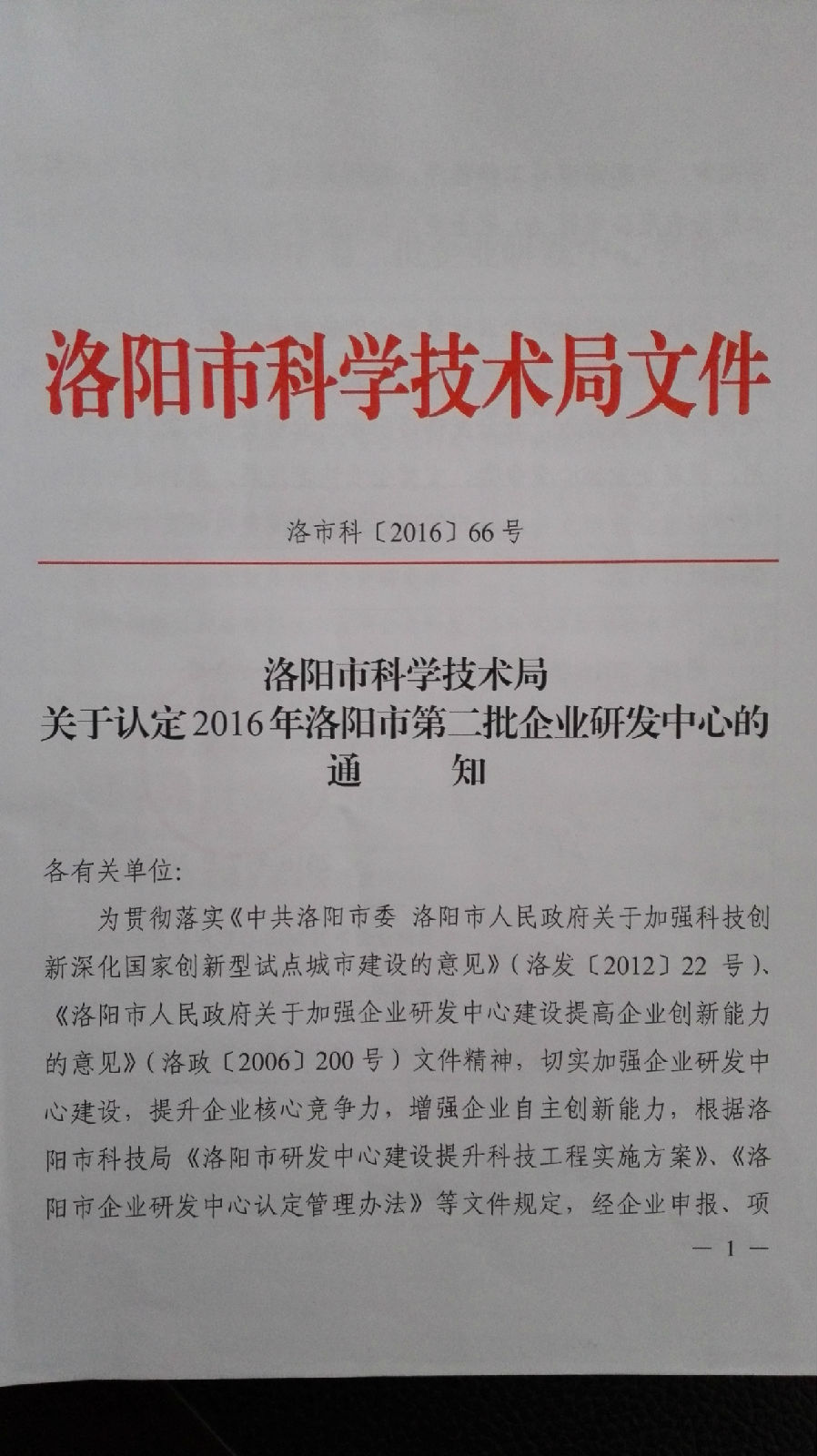 2016年8月, 公司設(shè)立的“洛陽市有機(jī)廢氣治理溶劑回收再利用企業(yè)研發(fā)中心”獲得洛陽市科技局認(rèn)定。(《洛陽市科技局關(guān)于認(rèn)定2016年洛陽市第二批企業(yè)研發(fā)中心的通知》洛市科【2016】66號(hào)文件)